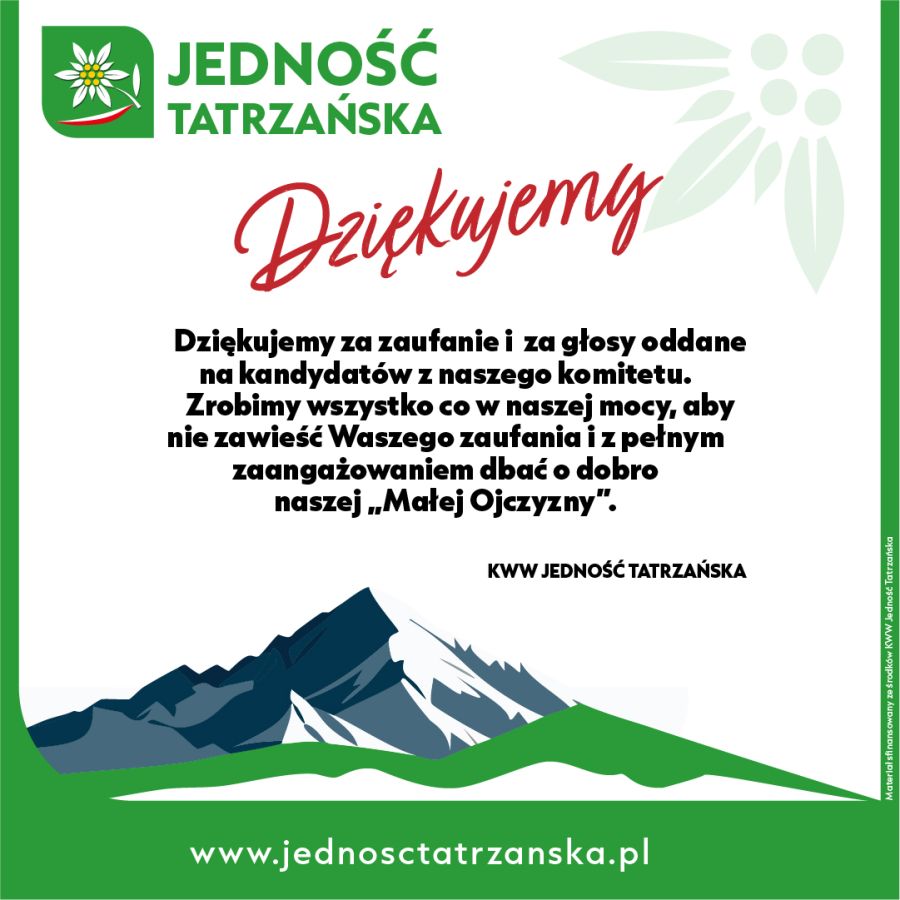 Serdecznie dziękujemy za każdy oddany głos na kandydatki i kandydatów z KWW Jedność Tatrzańska w minionych wyborach samorządowych.